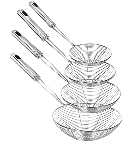 Spindelskum i rostfritt stål 4-pack professionell ståltrådsskum sil och avlopp vatten eller olja metall skum matlagningsgrill handtag hög värmebeständighet-14/16/18/20 cm