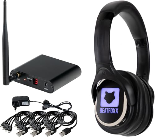 Beatfoxx SCBS-41 Silent Disco V2 USB-C Band Set – Silent Rehearsal Set med 4 hörlurar och 1 sändare – för tyst testband – platsbesparande – utbyggbar efter behag – inkl. strömförsörjning