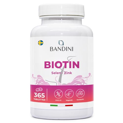 Bandini® Biotin för hår, naglar och hud - Tillskott med Selen, Zink och Vitaminer - Hårväxt och motverkar håravfall - 365 tabletter - Hög dosering och absorption - 1 års komplett behandling