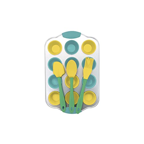 Zenker 44897 Mini Cupcakes set för barn med spatel, sked, pensel, form 12 avtryck och 12 lådor, silikon, kolstål, blå, grön, gul, grå, från 5 cm till 30 cm