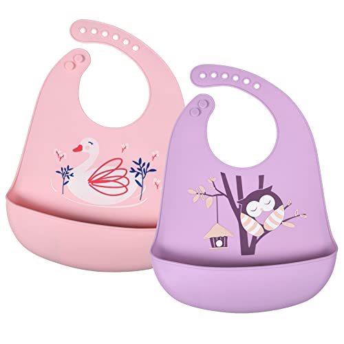 Vicloon Babyhaklappar i silikon, 2 stycken babymatningskjäll med uppsamlingsbricka, 6 justerbara knappar, BPA-fri, babyhaklappar, enkel rengöring, vattentät, för spädbarn, pojkar och flickor