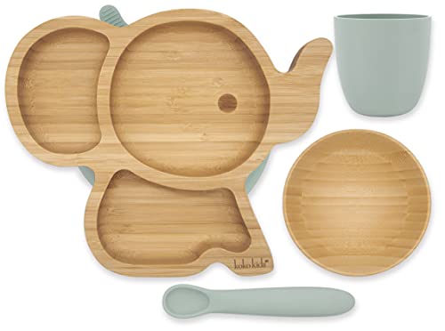 Koko Kids® 4-delars Bambu and Silikon Matnings Set ~ Bambu Elefant Tallrikmed och Skål med Sugring, Silikon Kopp och Skedmboo Weaning Set (Grön)