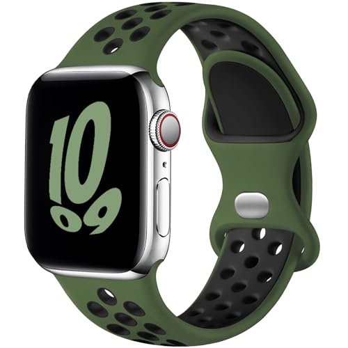 Upeak Sportrem, kompatibelt med Apple Watch-armband, 40 mm, 41 mm, 38 mm, 42 mm, ventilerande silikonband med dubbla hål, för iWatch serie 10, 9, 8, 7, 6, 5, 4, 3, 2, 1 SE, Ultra, L, armégrön/svart