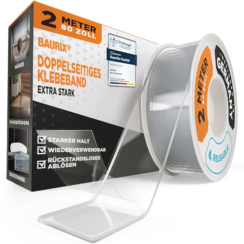 BAURIX® Dubbelhäftande Tejp [2m] - Nanohäftande tejp extra stark - genomskinlig tvättbar dubbelhäftande silikontejp - Stark mångsidig dubbelsidig Nano-tejp