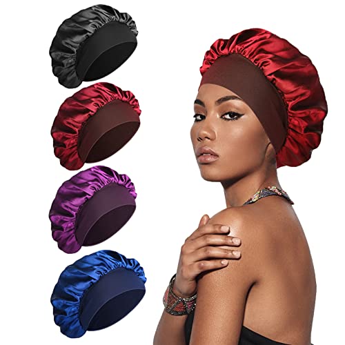 SÖT VIEW 4 st silkeshättor satänghätta, silke hårsjal för att sova, mjuk och bekväm sovmössa i silke, Svart, röd, marinblå, lila, 14.6 Inch (Pack of 4)