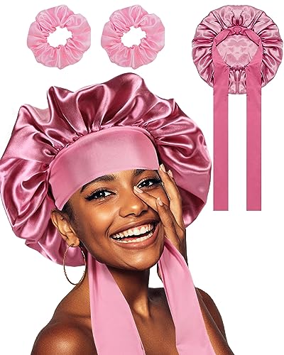 Carreuty Satin hårmössa sova för kvinnor, dubbelsidig silke bonnet bonnet sovmössa för natten för kvinnor med 2 hårband av siden, skydda hårmössa sovmössa hår, ROSA