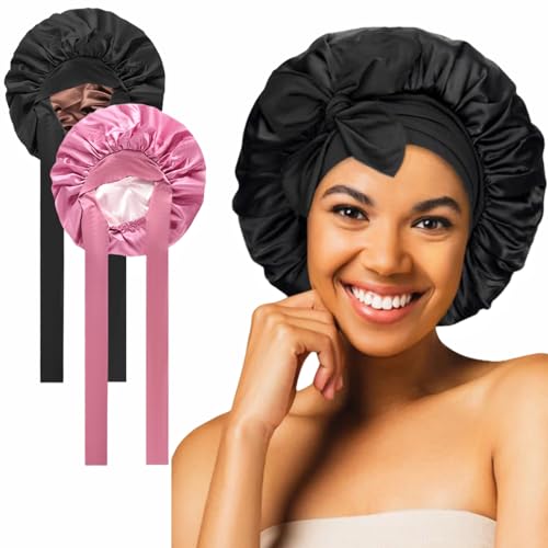 RVLZKCPG 2 stycken satinhårmössa, stor dubbelsidig silkeshuva för att sova, sovmössa silke för natten, bred bonnet sovmössa för kvinnor och flickor, Rosa, svart