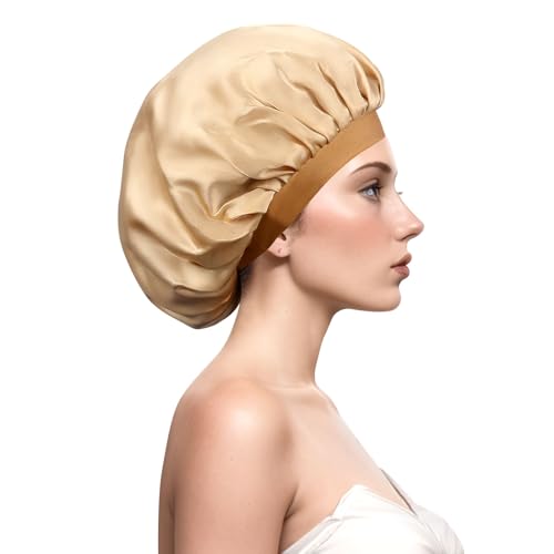 Desmend 19 momme silkeshuva för sömn sovmössa silke bonnet skyddar håret, lämplig för kort och lockigt hår 32 × 25 cm storlek M (1 st guld)