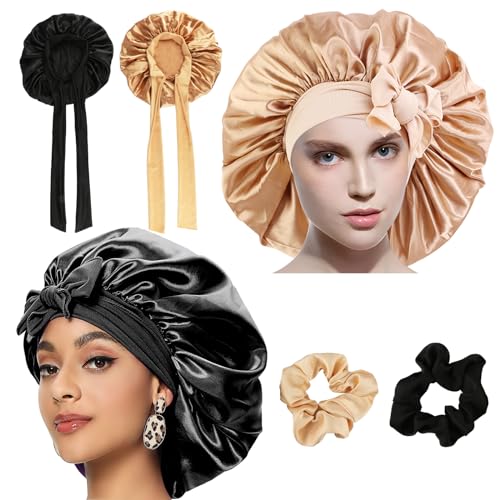Silkeshuvor, 2 stycken, för sömn, bonnet med 2 hårgummin, nattmössa, justerbar sovmössa av silke/siden, bred hårmössa av satin, hårmössa för natten för kvinnor och flickor (svart och guld)
