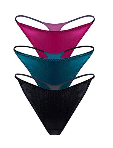Dam silke spandex g-string stringtrosa, sexiga t-back underkläder med mjuk satin, Rosa violett och turkisk blå och svart, L