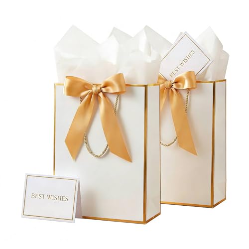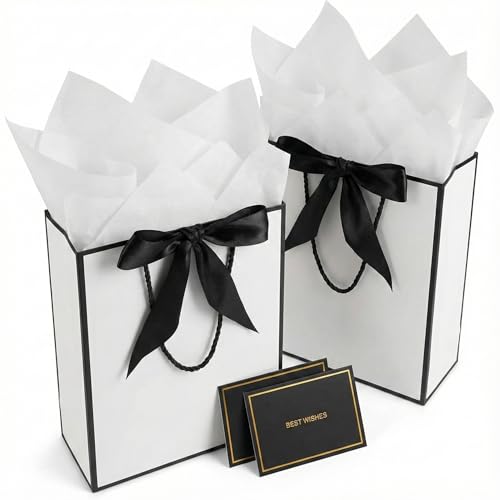 MtnLaur presentpåsar vita 2pack, presentpåsar med handtag och band, mellanstora presentpåsar i papper med silkespapper och gratulationskort, för flickor, kvinnor, födelsedagar, bröllop och babyshowers