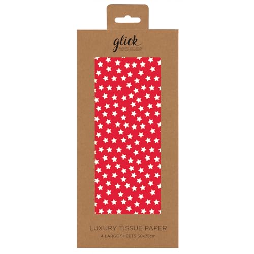Glick fyra ark silkespapper, röda stjärnor på vitt, jul, födelsedagar, för inslagning och konst och hantverk, röd & vit