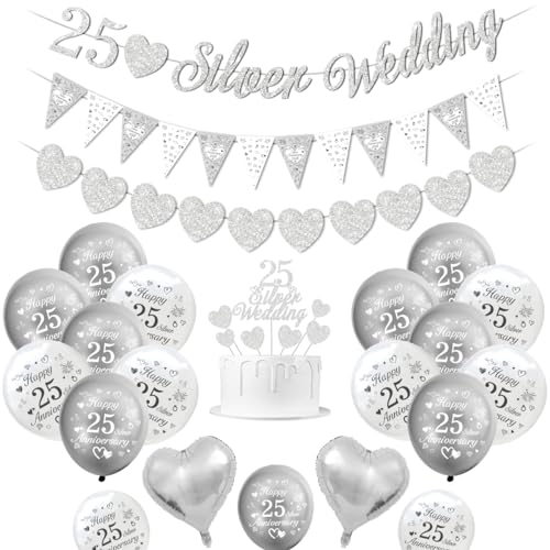 KISPATTI Silver bröllopsdekorationer, 25:e bröllopsdag dekorationer 25 silver bröllop banderoll grattis på 25-årsjubileum ballonger silver vita ballonger hjärtballonger 25 silver bröllopstårta topping