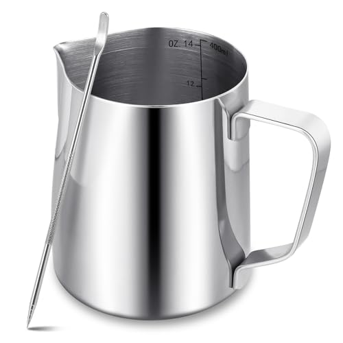 Mjölkskummare kanna, 400 ml/14 oz mjölkkanna med latte dekorativ konstpenna, metall barista mjölk skummande kanna kopp för kaffemaskin (silver)