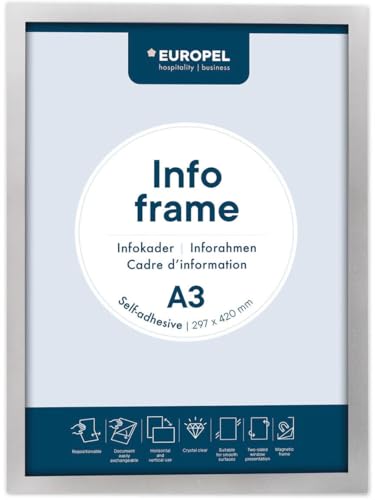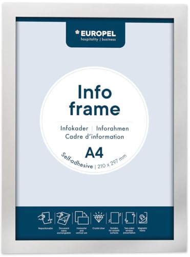 EUROPEL Magnetisk självhäftande skärmram i PVC, A4 silver, 2 delar, flyttbart lim, synlig dubbelsidig, porträtt eller landskap, total storlek 325 x 238 mm