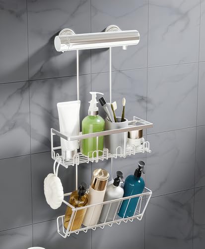 RUIHANDA Dubbel duschhylla utan borrning [ytterligare förvaringsutrymme] – duschhylla för upphängning på kranen, med flera krokar, stabil, [inget lim], silver