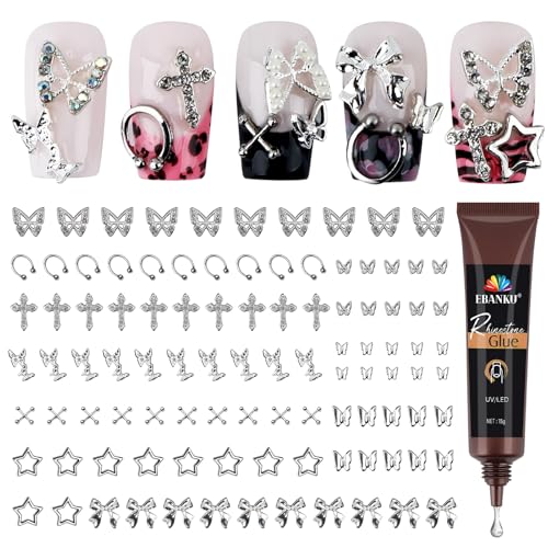 EBANKU 100 ST Nagelberlocker, Y2K Silver Charms Butterfly Bow Star Cross Nail Gems Set med 15g Nail Strass lim, Nailsmycken Nagelstift Nageldesignkristaller för kvinnor Nageldekorationer (10 stilar)