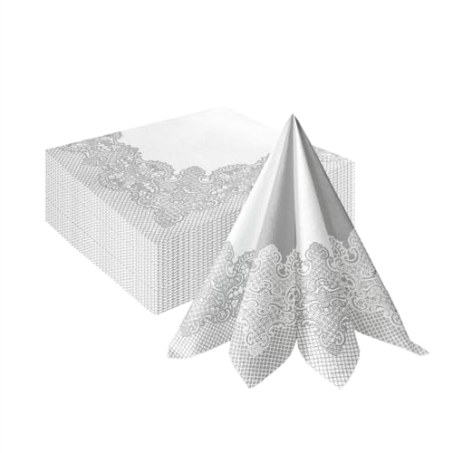 PAW - Airlaid servetter (40 x 40 cm) I 50 stycken I perfekt för bröllop, dop, nattvard, födelsedag, I högkvalitativ bordsdekoration, bakmönster, dammliknande I omvänd kunglig spets silver-vit