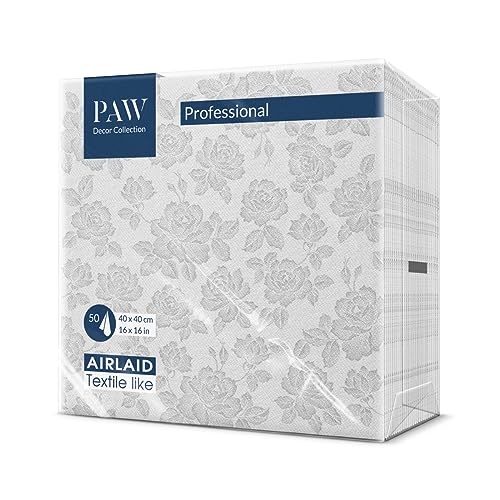 PAW – servetter av Airlaid – tygliknande (40 x 40 cm) I 50 stycken I perfekt för bröllop, dop, nattvardsgång, födelsedag I tygservetter – ornament, silver, rosor I färg: Subtle Roses (silver)