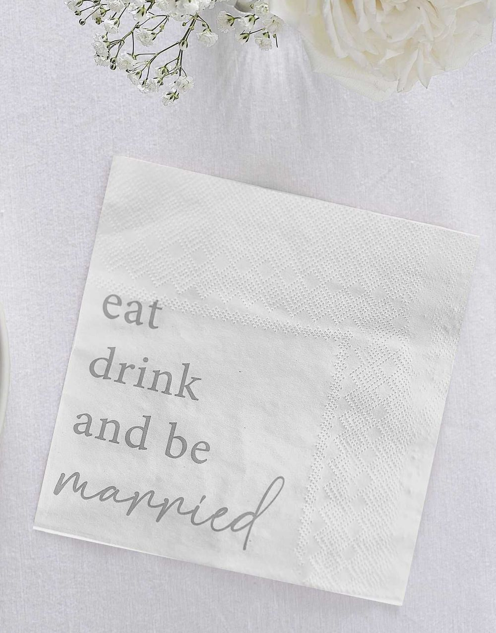 16 st Vita Servetter med Silverfärgad "Eat Drink and Be Married" Text 33x33 cm - Modern Luxe