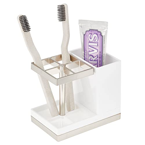 mDesign fristående tandborsthållare – tandborststativ med plats för 4 borstar och tandkräm – hållare för tandvårdsprodukter – vit och matt silverfärg