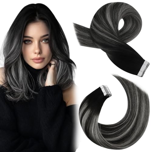 YoungSee mänskligt hår tejp hårförlängningar ombre svart balayage svart med silver långvarig 50 g 20 st