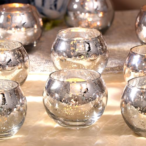 LAMORGIFT Ljushållare med silverljus set med 12 – kvicksilverglas ljushållare – värmeljus ljushållare för heminredning och bröllop/fester bordsuppsatser