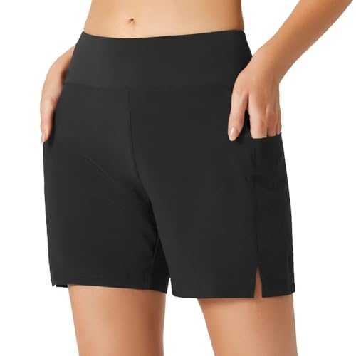 ACWOO Simshortsdam, Magkontroll Hög Midja Simbräda Shorts Med Fickor, Simbräda Badbyxor För Kvinnor, Snabbtorkande Högmidjade Simbyxor För Kvinnor(M)