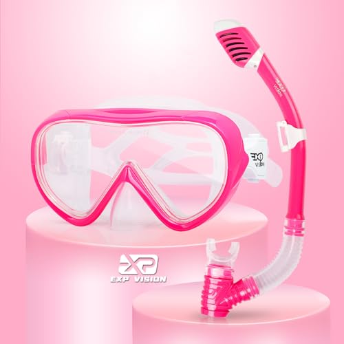 Snorkelset för barn, panorama, snorkelmask, anti-dimma dykmask för ungdomar, anti-läckage, torr toppsnorkling, härdat glas, barn simmask professionell snorkling, simning (rosa set)