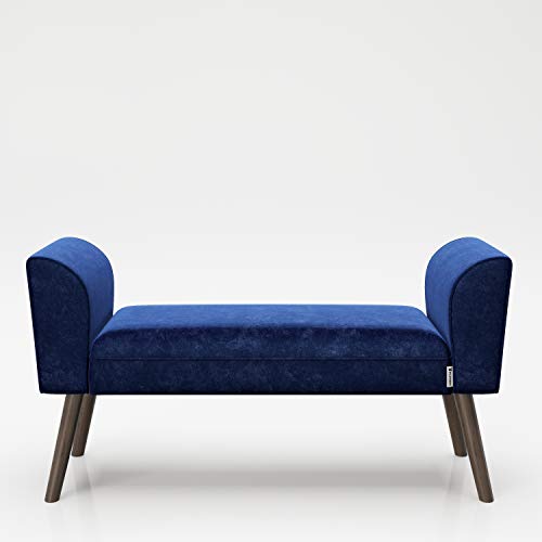 PLAYBOY Sittbänk med sammetsbeläggning i blått och robusta massiva träfötter, vadderad bänk, sittpall, fotpall med sammet, retrodesign, klubbstil för hall och entré