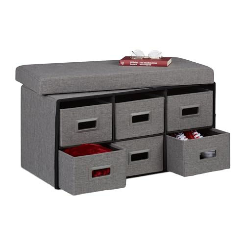 Relaxdays sittbänk med lådor, 6 lådor, sittdynor, H x B x D: 39 x 75,5 x 37 cm, hall, vikbar sittkista, grå