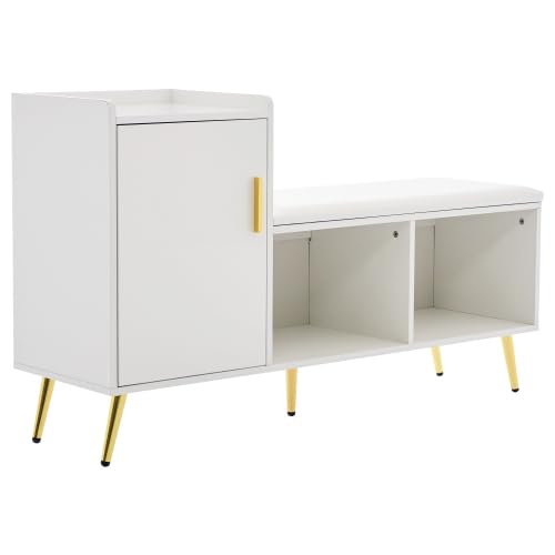 HAINEW Skobänk med sits, sittbänk med förvaringsutrymme, vadderad skohylla, hall, bänk, skoskåp med 1 dörr och 2 öppna förvaringsfack, garderobsbänk för vardagsrum, hall, 120 × 35 × 69 cm, vit