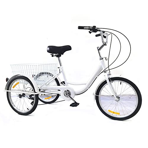 HuKaiL 20 tums trehjuling för vuxna, 8 växlar trehjulingar dubbelbroms med inköpskorg och ryggstöd sittdyna, höjdjusterbar trehjulig för vuxna och seniorer, vit