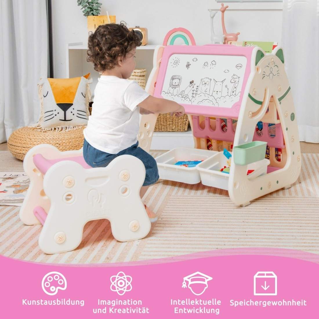 3 i 1 sittgrupp för barn & svart tavla & bokhylla med 3 förvaringslådor & pall rosa