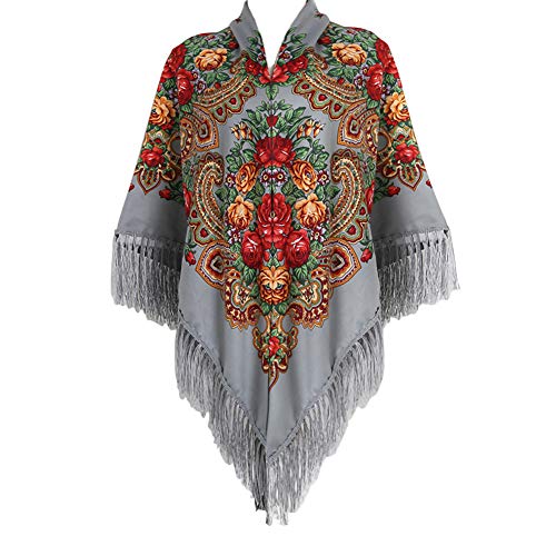 Gudessly 157 cm x 157 cm oversized traditionell retro sjal för kvinnor, sjalmönstrad poncho med blommigt tryck och tofsfransar, Grå, 62 * 62inch