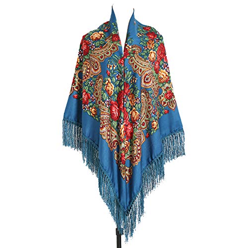 Gudessly 157 cm x 157 cm oversized traditionell retro sjal för kvinnor, sjalmönstrad poncho med blommigt tryck och tofsfransar, Blå (Lake blå), 62 * 62inch