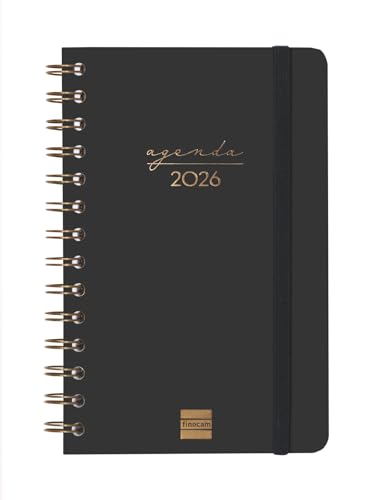 Finocam - Spiralplanerare 2026 1 dag sida | januari - december (12 månader) | Årlig planerare 2026 med elastiskt gummi | spiral dubbelt hårt lock spiral spiral själ - svart - katalanska