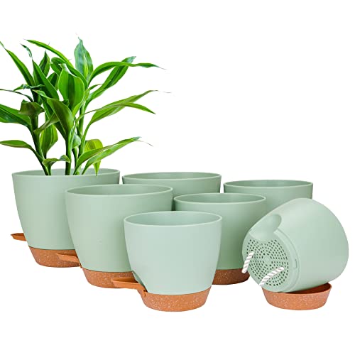 Blomkrukor plast med bevattningssystem 17,8/16,5/15,2/13,9/12,7 cm, självbevattning, med underlägg, rund, för inomhus, balkong, trädgård, växter, suckulenter, grönbrun