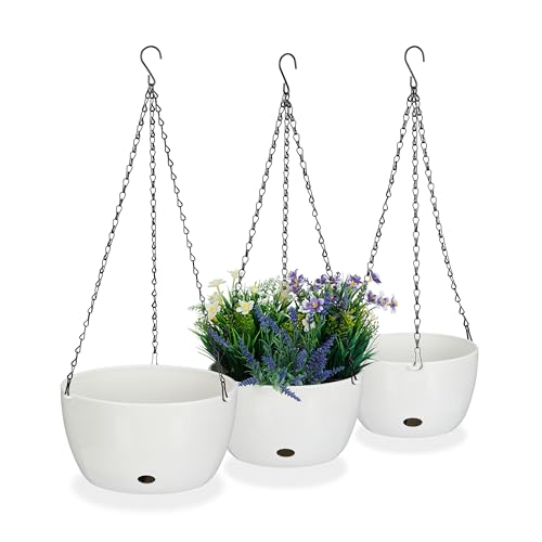 Relaxdays Blomampel med vattenbehållare, set, 3 storlekar, självbevattning, utomhus och inomhus, hängande blomkruka, vit, plast, 67 x 28,5 cm