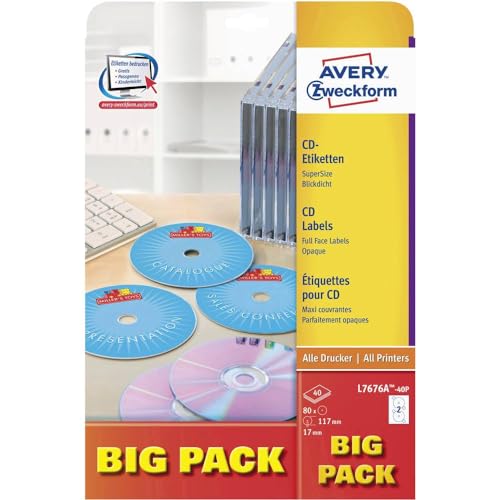 AVERY Specialform L7676A-40P självhäftande CD-etiketter (genomskinlig CD-dekal, Ø 117 mm Supersize, 80 tryckta självhäftande etiketter på 40 ark, för alla A4-skrivare) vit