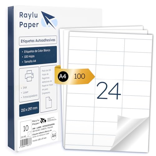 Raylu Paper ® - Vita självhäftande etiketter för utskrift, A4-ark Pappersklister För Inkjet-skrivare, Laser Och Fotokopiatorer, 24 etiketter per ark (70 x 37 mm)