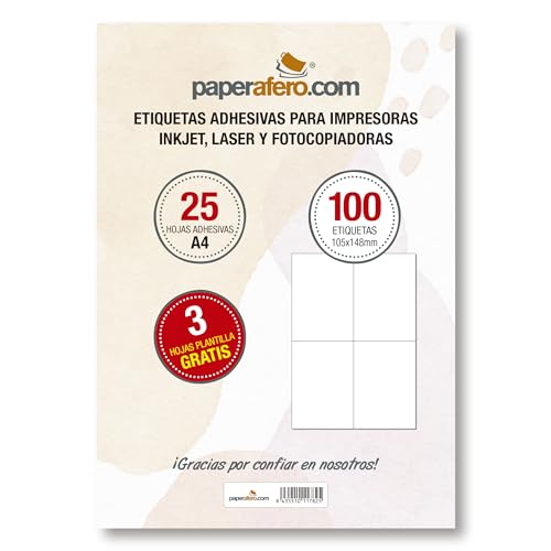 Självhäftande pappersetiketter | 100 etiketter | Storlek 105 x 148 mm | Självhäftande papper för utskrift på alla skrivare, perfekta självhäftande vita klistermärken för hemmabruk och yrkesmässig
