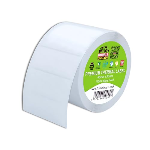 Double Dragon, 1 100 direkttermiska etiketter, 60 mm x 30 mm | Premium belagda, självhäftande vita klistermärken | Rep-resistant | Kompatibel med Zebra, MUNBYN, Rollo, Toshiba, Citizen skrivare