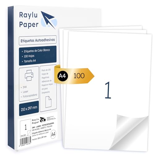 Raylu Paper ® - Vita självhäftande etiketter för utskrift, 100 Pack Papper Adhesive Klistermärken I A4-ark För Inkjet-skrivare, Laser & Fotokopiatorer, 1 Etikett per ark (210 x 297 mm)