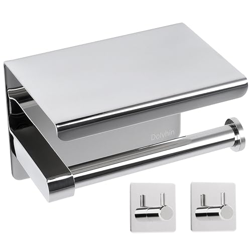Dolvhin Toalettpappershållare utan borrning inkl. 2 handdukskrokar | Toalettpappershållare med hylla | Klorrullhållare självhäftande rostfritt stål | Toalettpappershållare badrum | polerad krom