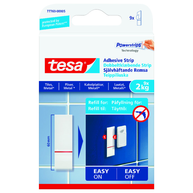 tesa Powerstrips självhäftande remsor för kakel och metall 2 kg – dubbelsidiga remsor för fasta, släta ytor – upp till 2 kg hållkapacitet per remsa – 9 stycken
