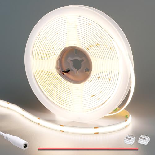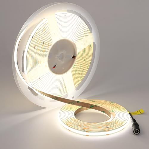 COB LED Strip 5M Varmvit, 24V Dimbart LED-ljusband 3000K, Självhäftande LED-list med Fjärrkontroll, Vattentät IP44 Ljusslinga med Strömadapter, LED-band för Badrum Kök TV-bänk (Timer)