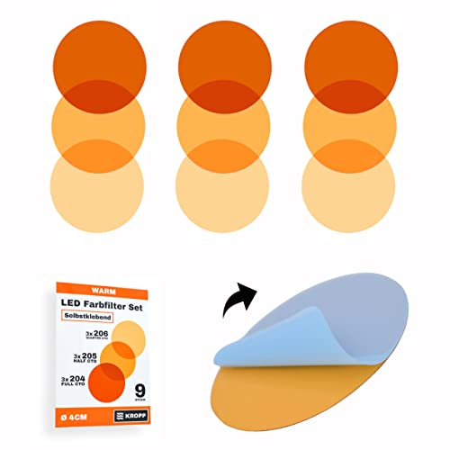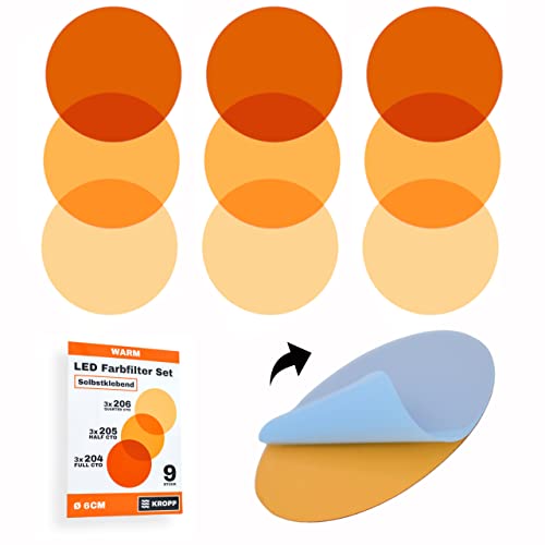 KROPP självhäftande färgfolier för LED-lampor, ⌀4 CM, ⌀5 CM, ⌀8 CM snitt, 3 toner varmvitt färgfilter för färgkorrigering, dagsljus till glödljus, filterset med 9 delar (⌀ 70 mm)