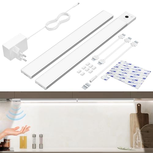 LED kök underskåp med dimbar sensor, 43 cm självhäftande kökslampor, LED-ljusstång kök med uttag, LED-belysning med justerbar garderob, 3 färgtemperaturlägen, 2-pack