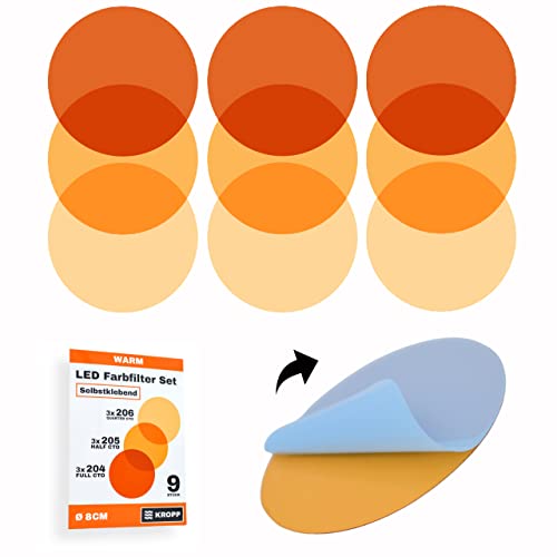 KROPP självhäftande färgfolier för LED-lampor, ⌀8 CM snitt, 3 toner varmvitt färgfilter för färgkorrigering, dagsljus till glödljus, filterset med 9 delar (⌀ 80 mm)